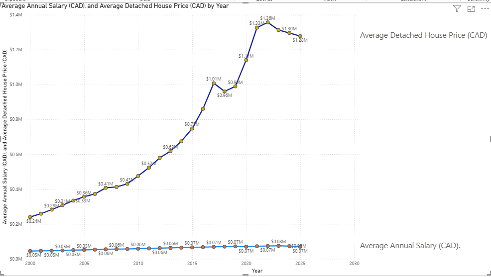 Toronto’s housing market has long been a symbol of Canada’s economic vitality, but in recent years, it has experienced a notable downturn. Detached home prices, which surged dramatically over the past two decades, began declining around 2022 and continued into 2025. This shift comes amid broader economic pressures, including stagnant wage growth relative to housing costs. By comparing average detached house prices and average salaries from 2000 to 2025, this article explores how affordability challenges have contributed to the market correction, alongside other key factors such as interest rates, inventory levels, immigration trends, and economic uncertainty.